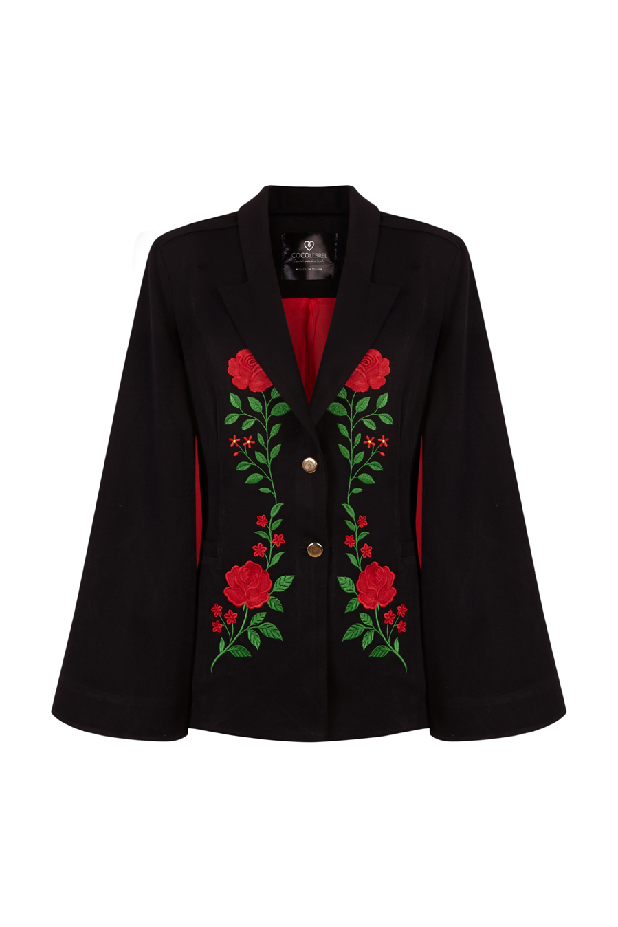 Diseñada con bordados florales delanteros en tonos rojos y verdes, que aportan un toque
