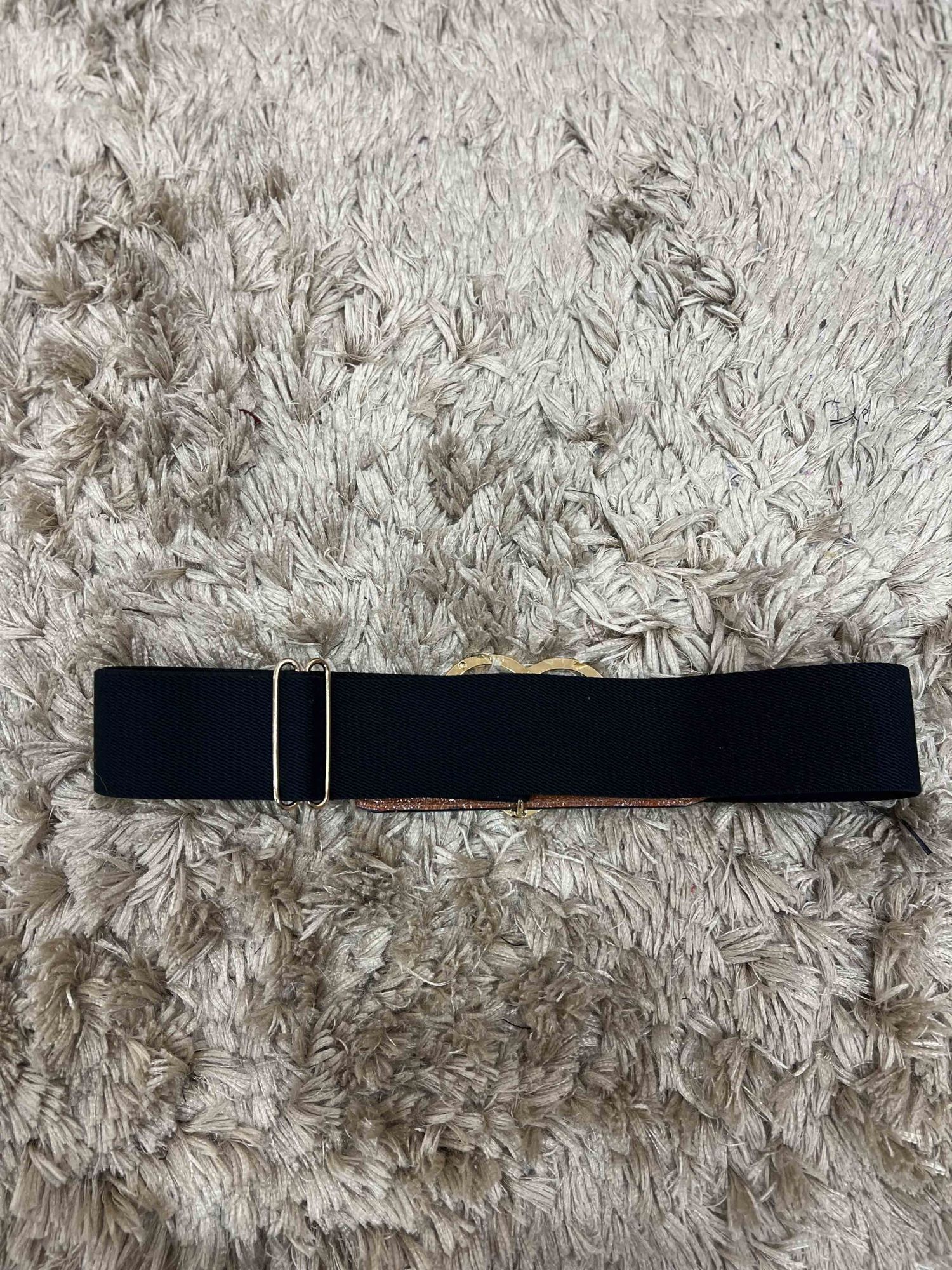 Cinturón negro con corazón elástico que se ajusta a todos los tamaños de cintura gracias al ajustable que tiene en la parte trasera.