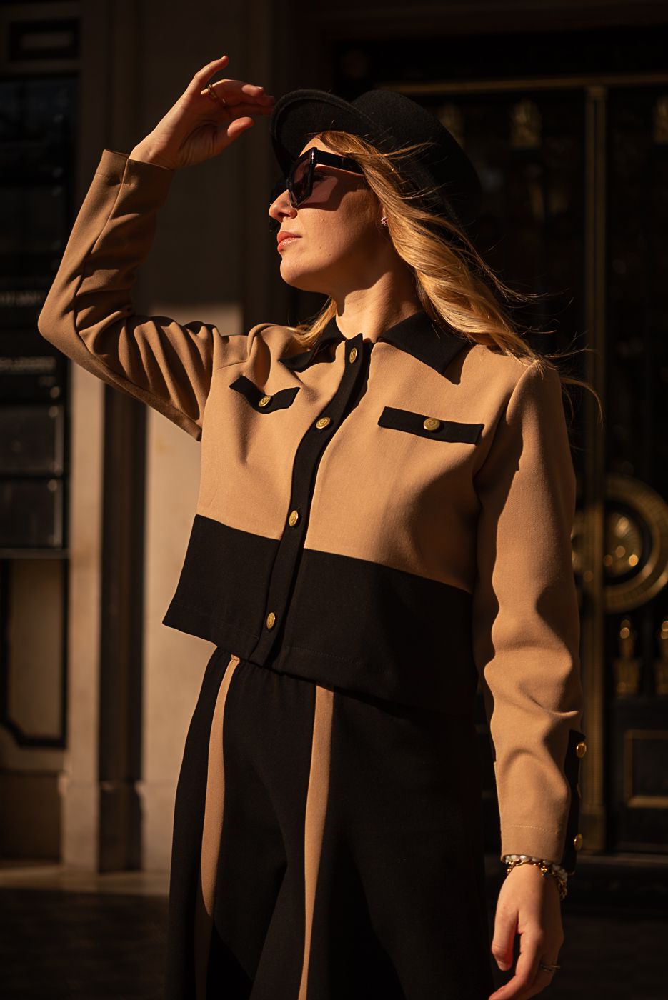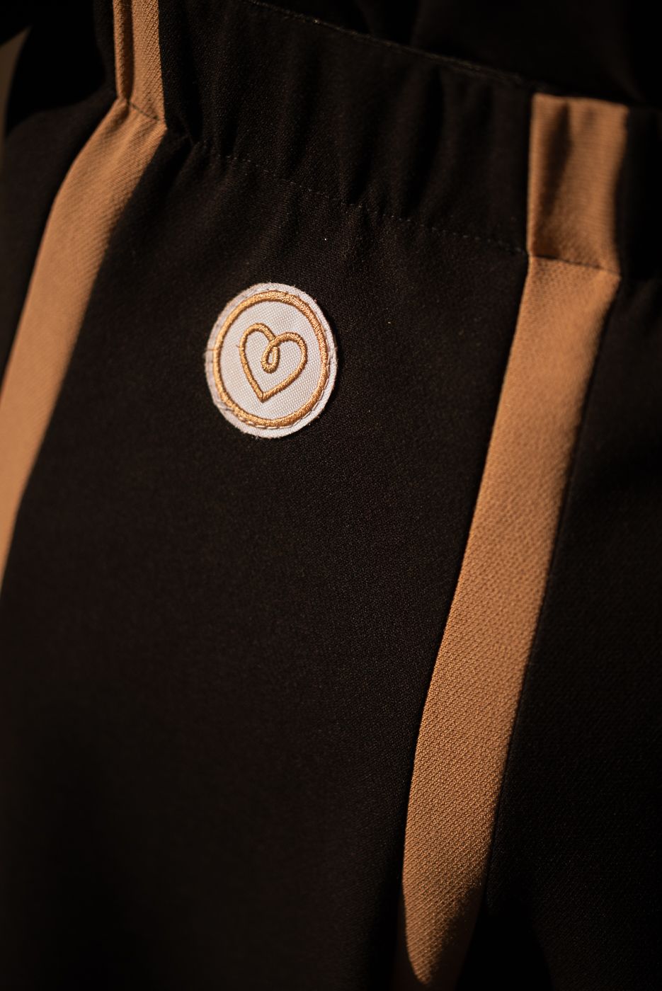El diseño combina el negro profundo y el beige cálido en líneas verticales que estilizan la figura y añaden un aire arquitectónico al conjunto. Su cintura elástica garantiza comodidad sin renunciar al estilo, mientras el icónico corazón Cocolebrel bordado en la parte trasera firma la prenda con un sello inconfundible.