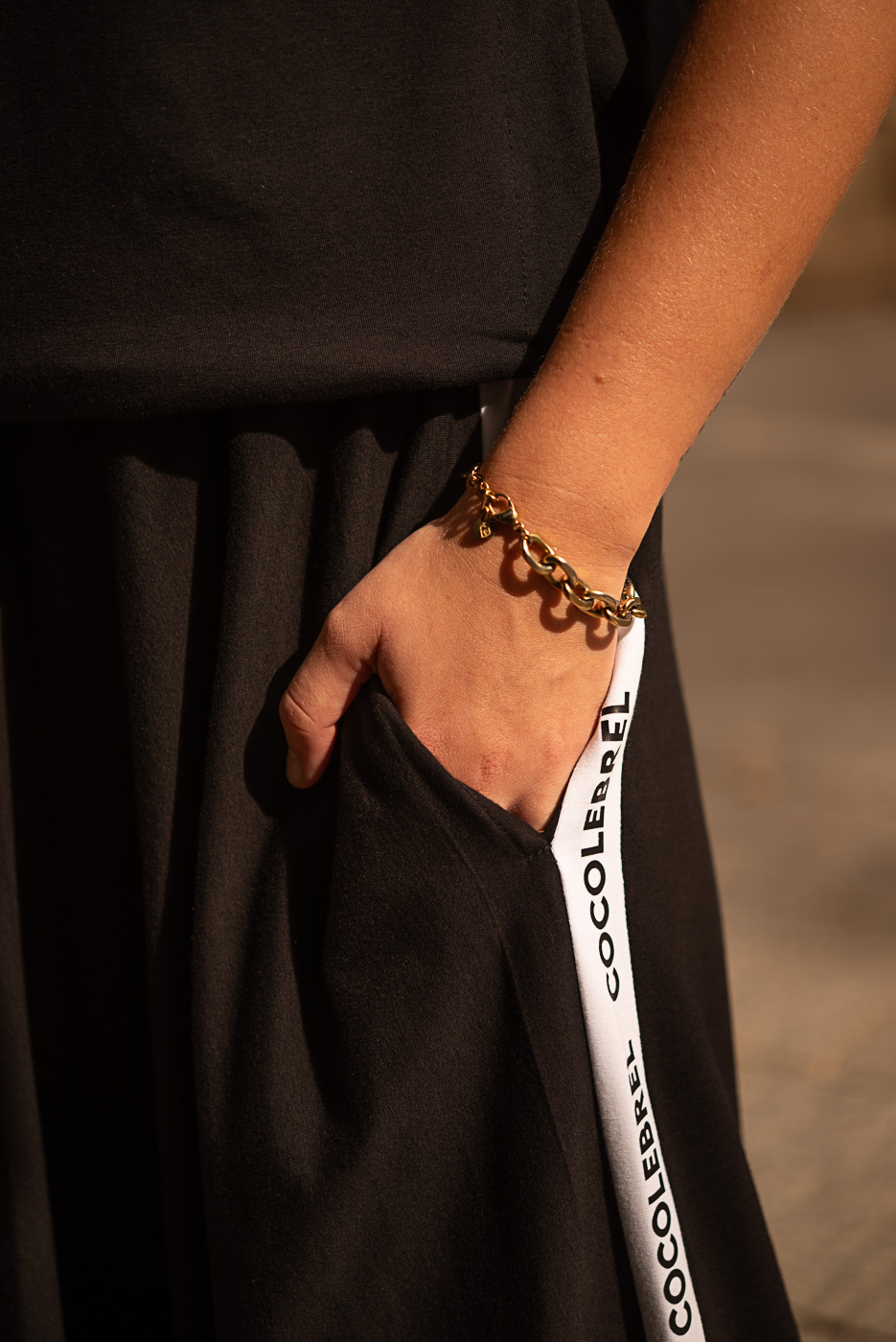 Decorada con bandas blancas en los laterales con mini logos Cocolebrel. Combínala con la bomber street y zapatillas o botas de serraje para un cocolook perfecto.