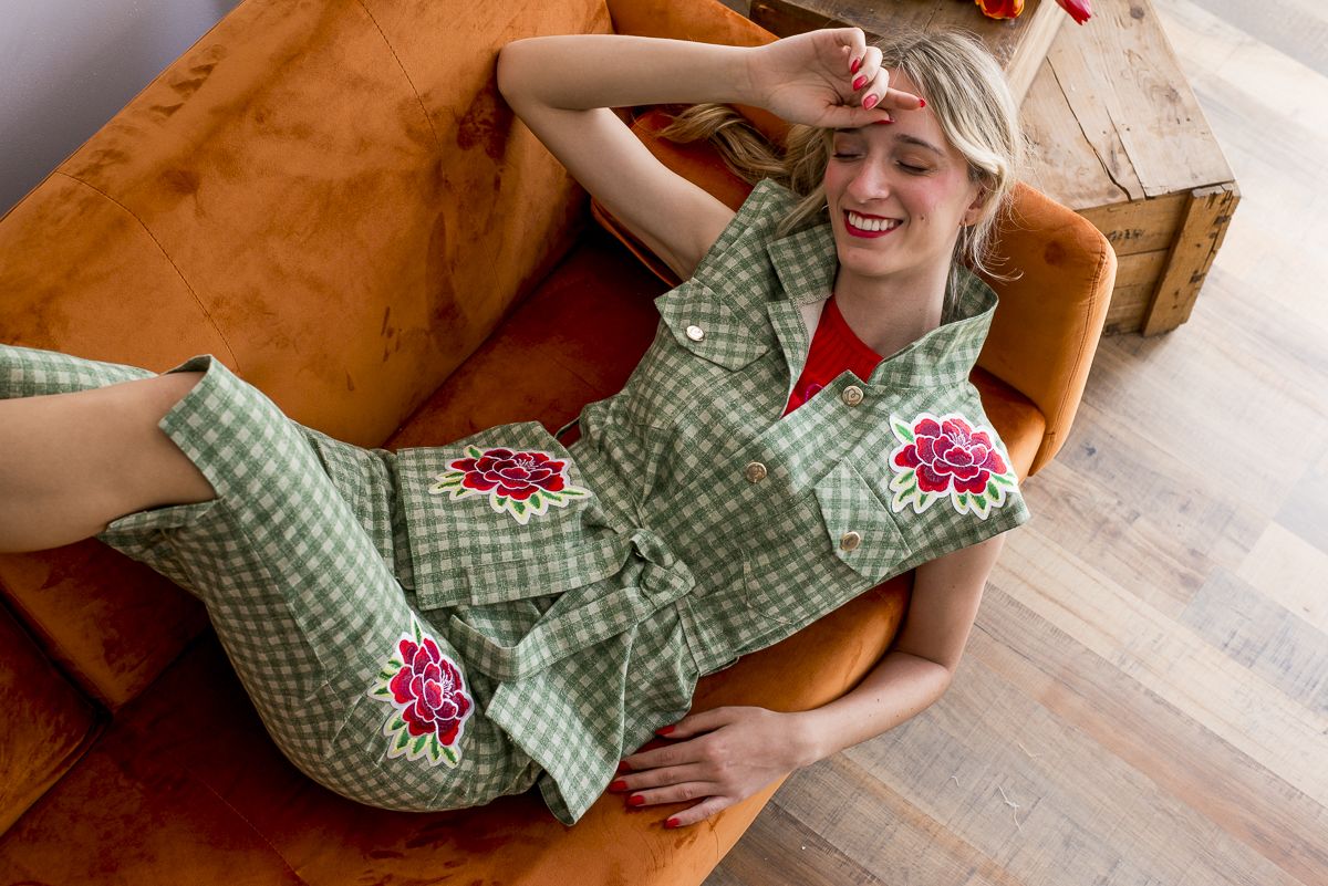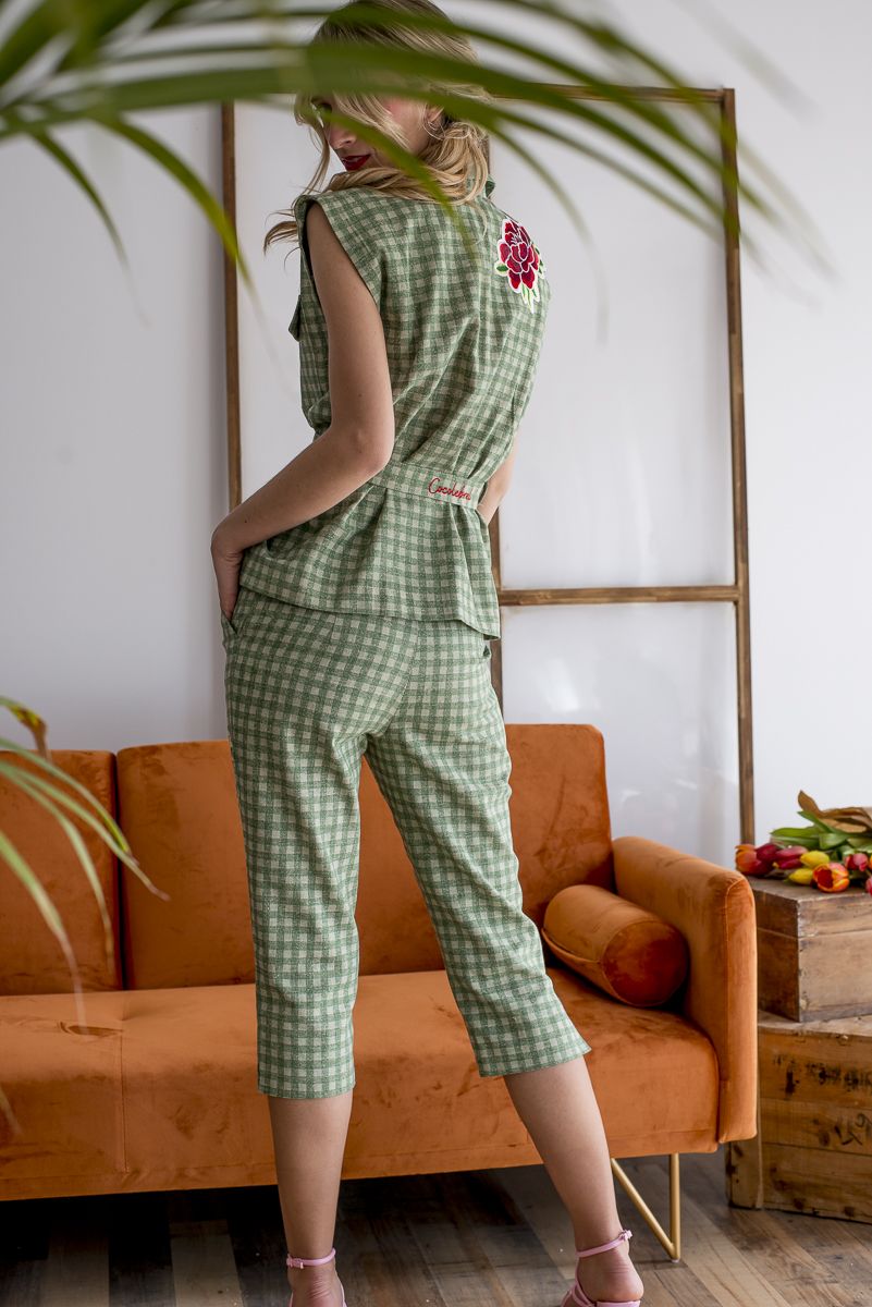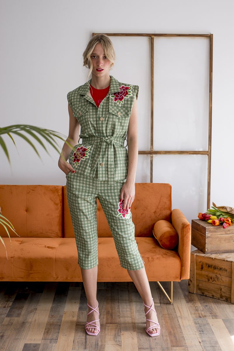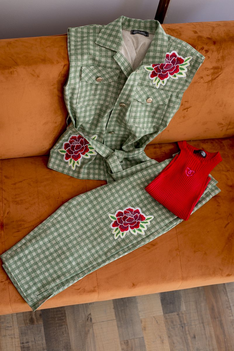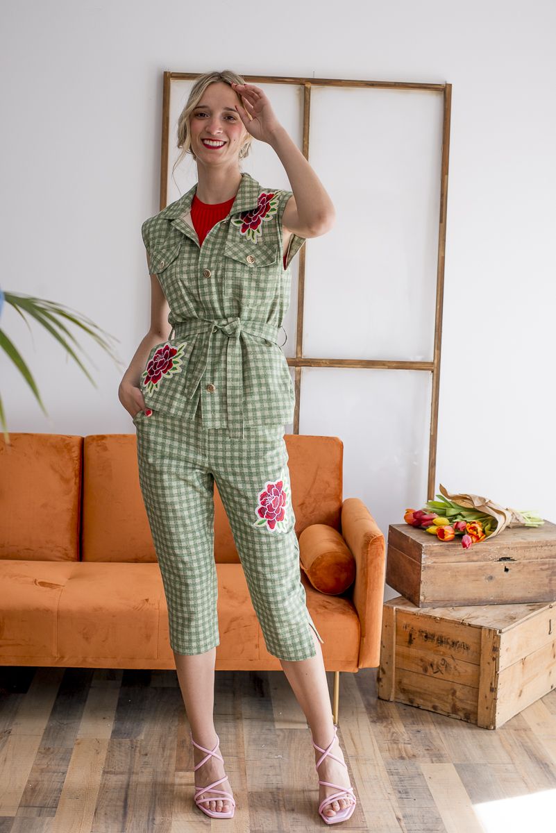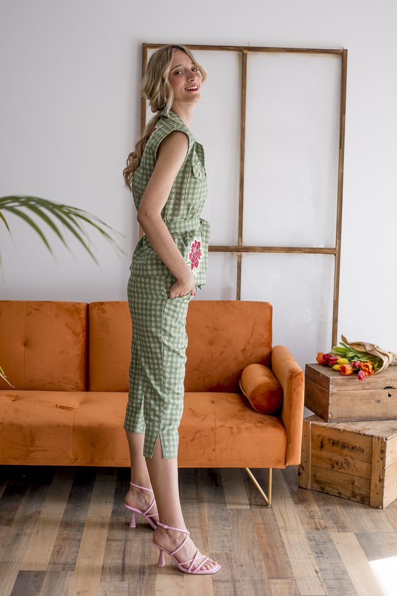 Confeccionado en algodón 100% aspecto lino y estampado VICHY de cuadros color verde & Beige.