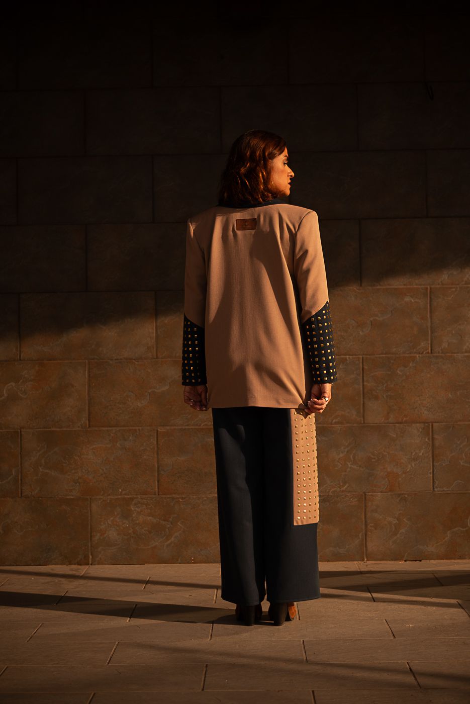 Su diseño destaca por la franja de tachuelas doradas en el lateral derecho, que aportan un toque sofisticado y moderno.