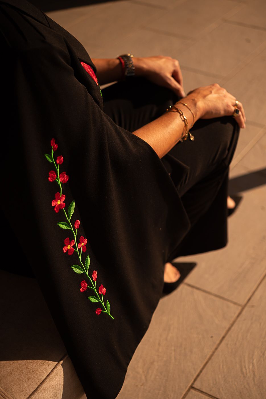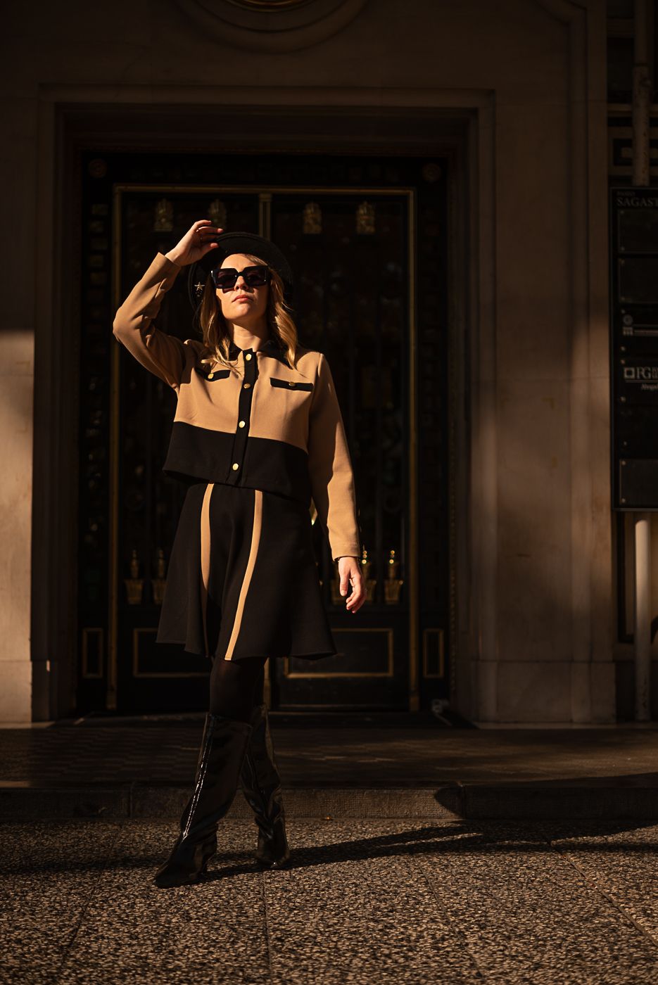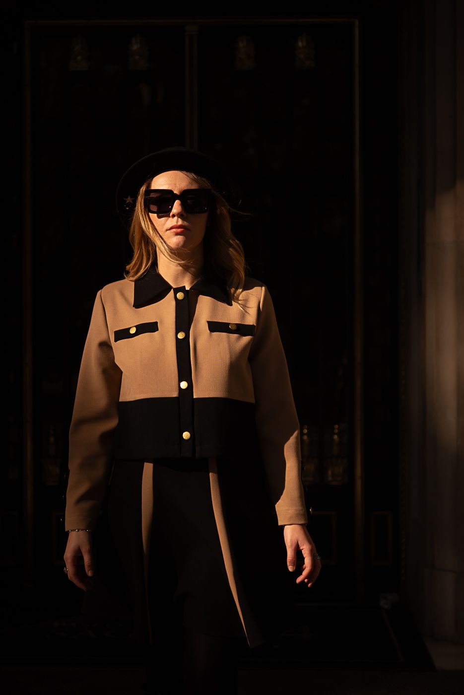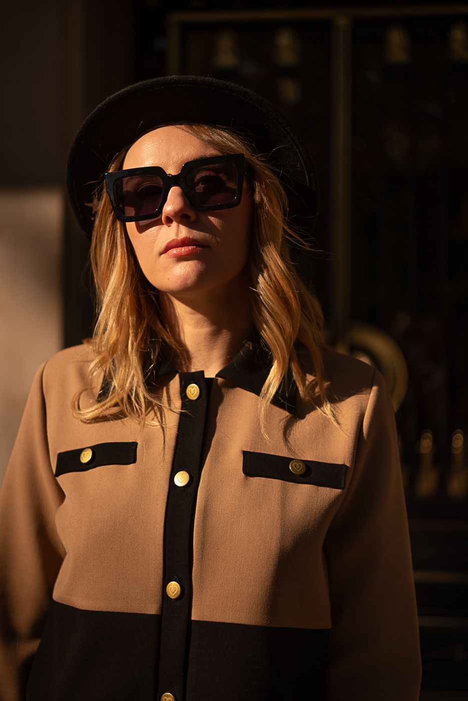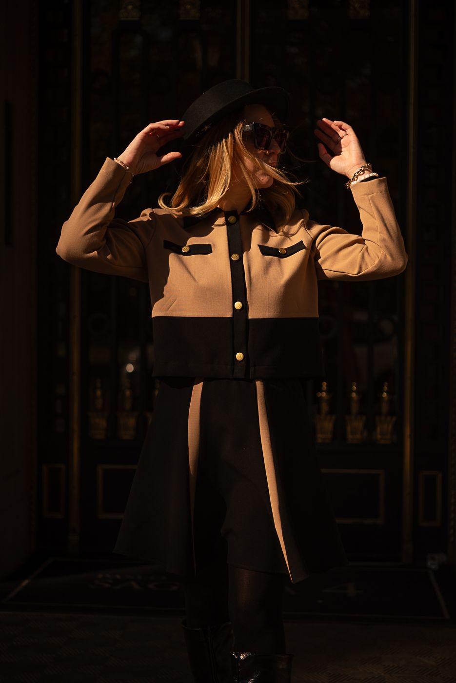 El contraste entre el beige cálido y el negro profundo dibuja líneas limpias y poderosas, mientras los botones dorados con el corazón Cocolebrel añaden ese detalle joya que la convierte en una pieza especial. Cada elemento está pensado para una mujer que ama la moda tanto como ama su libertad.