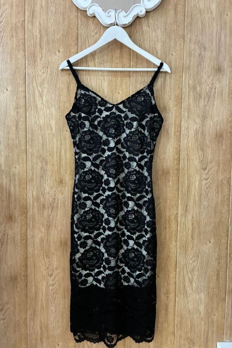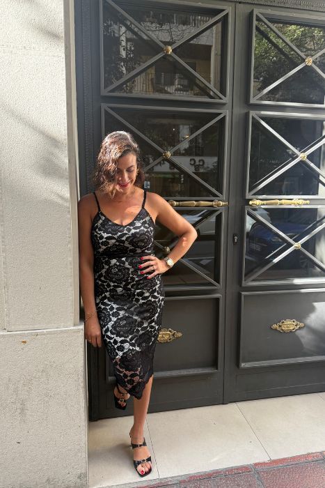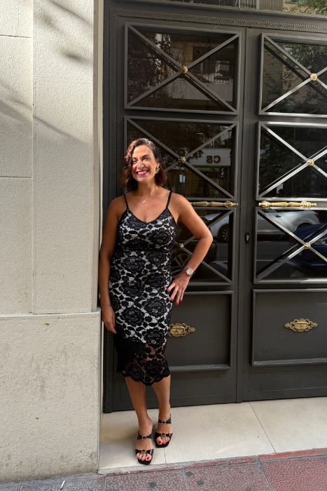 Este vestido midi combina la sensualidad del encaje negro con la pureza de un forro blanco, creando un efecto visual impactante y moderno que te enamorará.