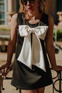 Vestido negro sin mangas y corte trapecio decorado con maxi lazo en color blanco.