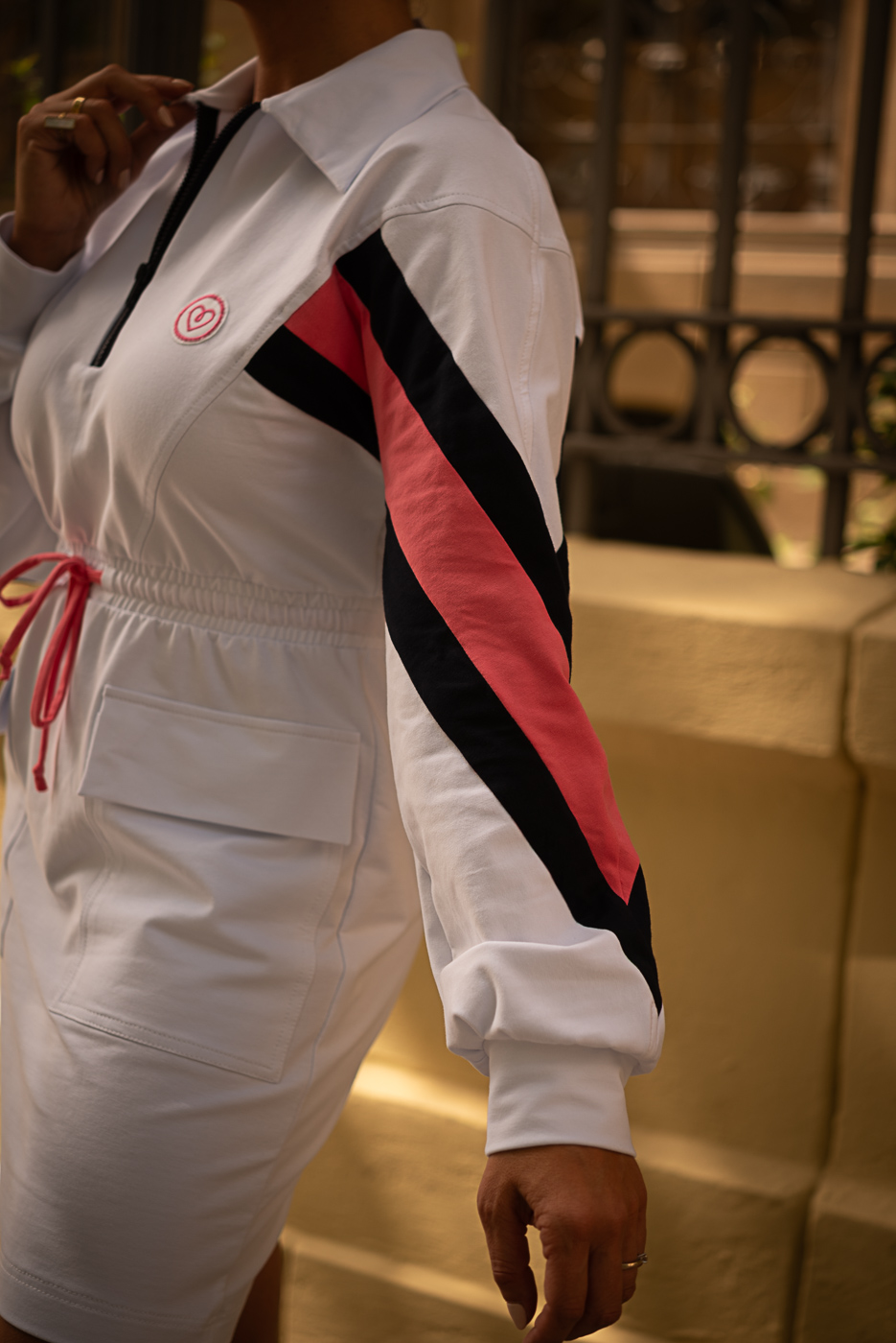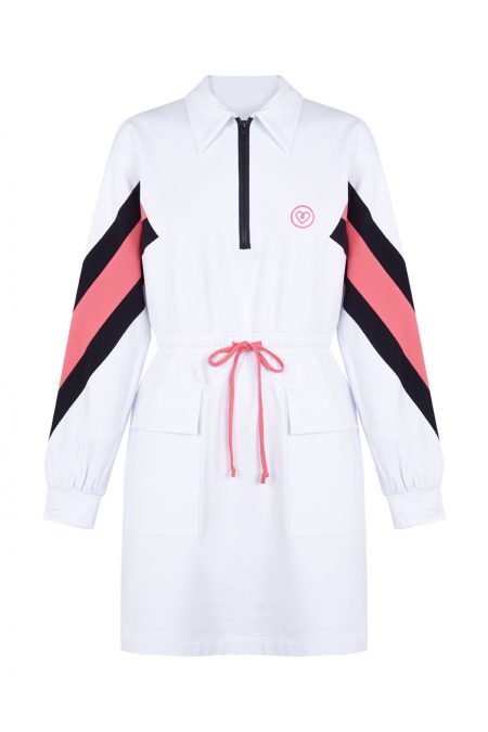 Diseño con detalle de maxi bolsillos y cremallera inyectada de alta calidad en color azul marino. Gracias a la cremallera, evitaremos que se nos roce el cuello. Cintura con cinturón elástico con goma soft y cordón en color rosa para que lo ajustes a tu figura.