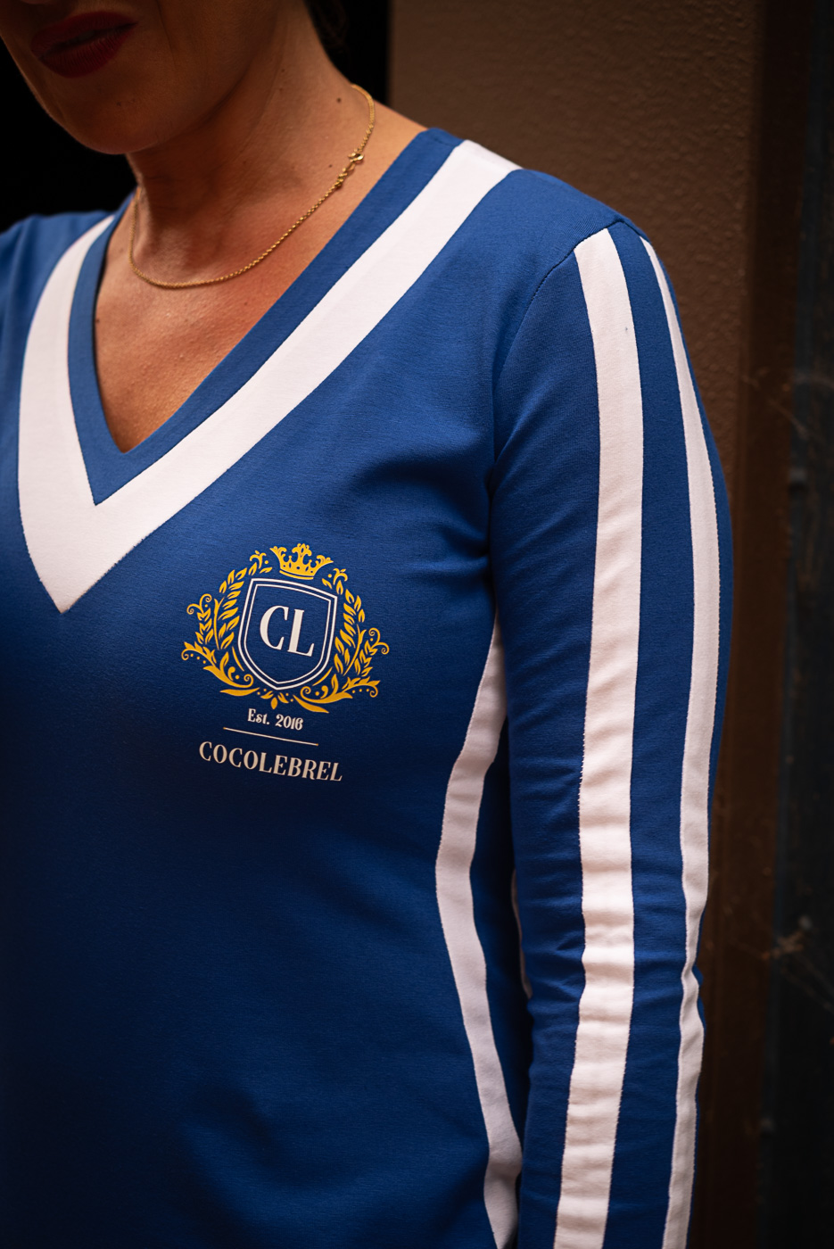 Decorado con detalles blancos en contraste en las rayas laterales y en el cuello de pico pronunciado. ¡Un vestido para todo y para todas! ¡Nos encanta!